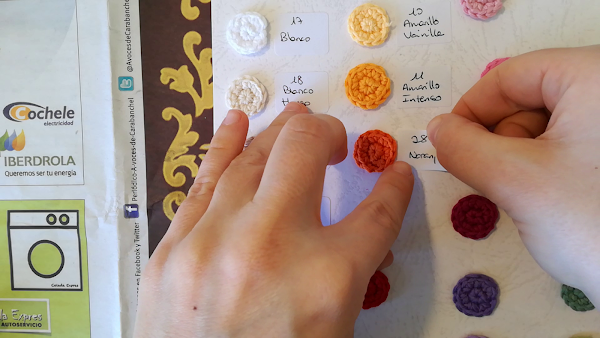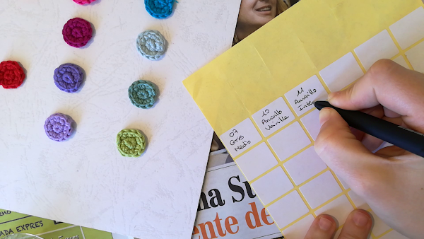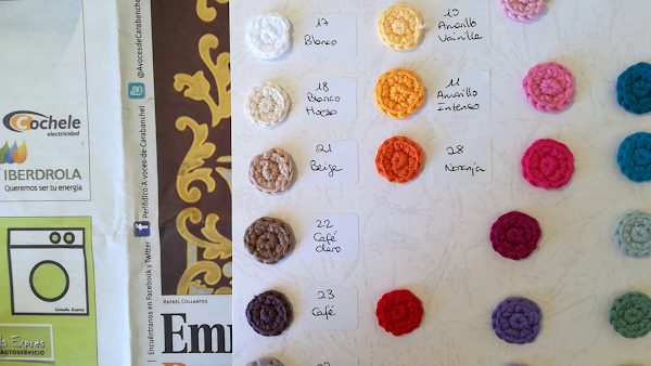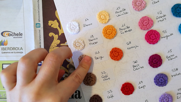 2. Apuntar en las etiquetas (o directamente en el cartón) los colores. La mayoría de marcas de ovillos tienen en su página web las cartas de color con la numeración y nombre de cada uno de los colores. Úsalas para realizar tu lista.