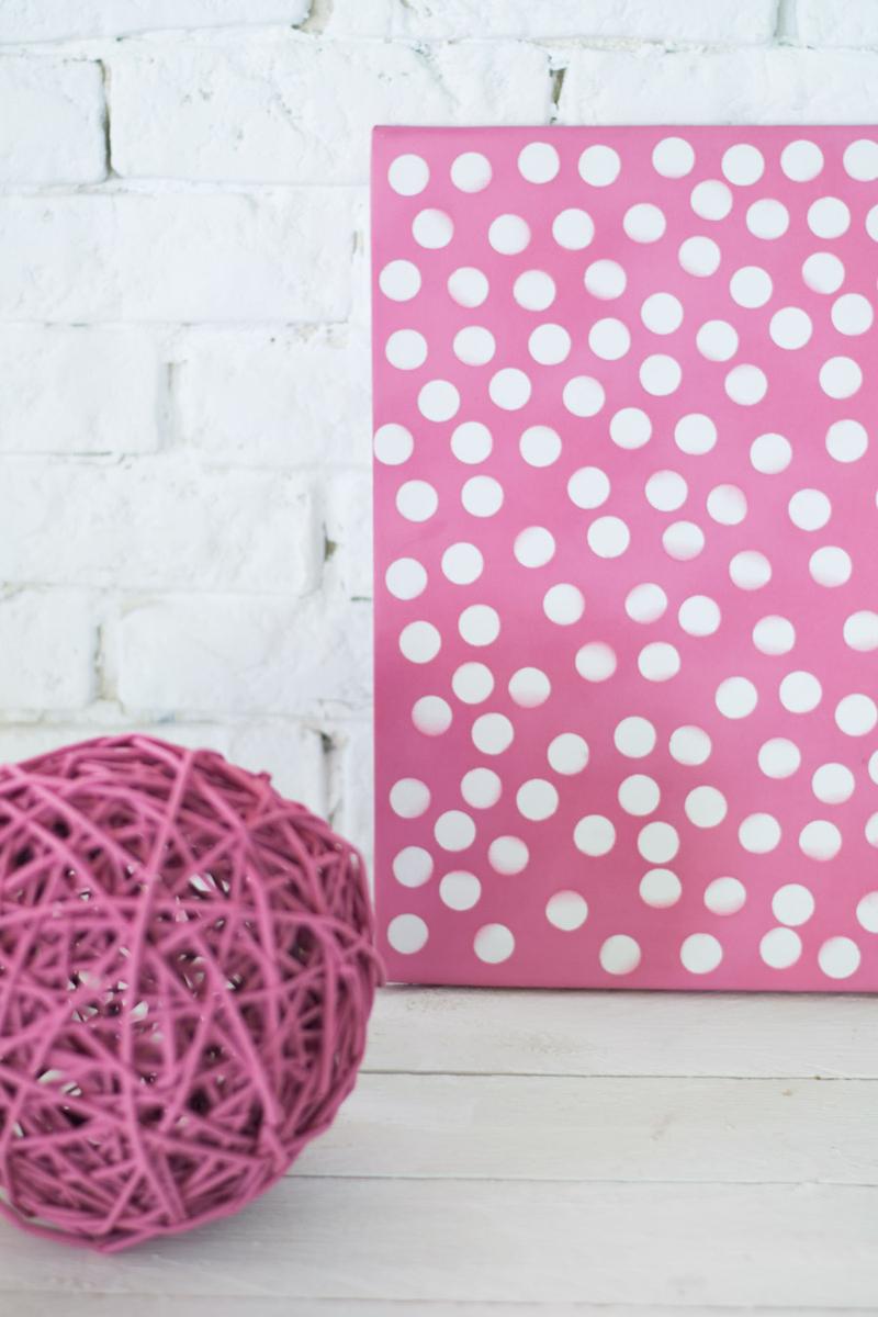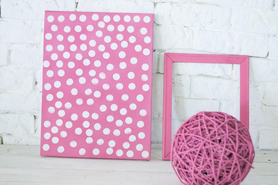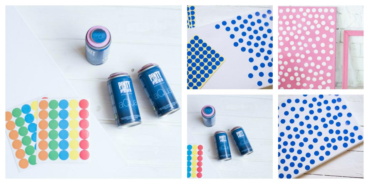 Pegamos nuestras pegatinas redondas en el lienzo y pintamos nuestro cuadro con la pintura en spray.