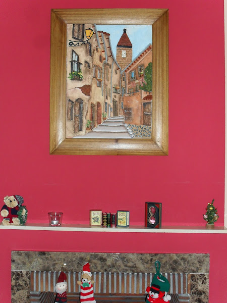 Hola Amigas: Os presento este cuadro que pinté el año pasado.. Me encanta hacer manualidades y pintar...porlotanto a este cuadro se me ocurrió la idea de hacerle algunas zonas en relieve..La fachada tiene un poquito de relieve con plaste y el color,, aunque luego retoqué con sombras. Las rocas tambien con plaste y dando mas relieve con la espátula,, haciendole las grietas y recodos...aunque luego ...