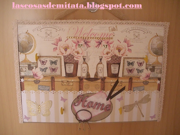 Recién terminado!! aquí os dejo las fotos de como ha quedado el cuelga llaves de Machu. Ella quería uno para la entrada de su casa así que me puse a pensar...cogí un tablero de madera le di una capa de imprimación y le añadi la servilleta. Para la parte inferior preferí el papel de rayas porque, además de irle en color a la entrada, puedo utilizar la técnica de embossing con los sellos de mariposa ...