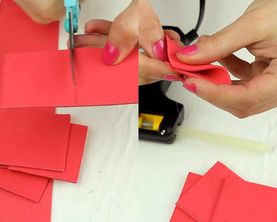 - Seguidamente, corta en la goma eva cuadrados de 5cmx5cm que después recortaremos y con la silicona pegaremos dos de sus esquinas.