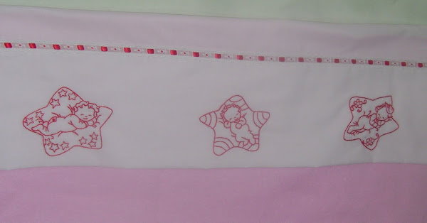 Mi primer Redwork......................Estas estrellas-almohadas con sus bebés me parecieron un lindo motivo para la primera sábana que le borde a mi nieta Sofía ( que está punto de llegar).Me resultò genial , ya que el color preferido de la madre es el rojo, el motivo es sencillo pero delicado.Transferí el diseño con papel carbónico amarillo y realicé el bordado en punto tallo, con puntadas peque ...