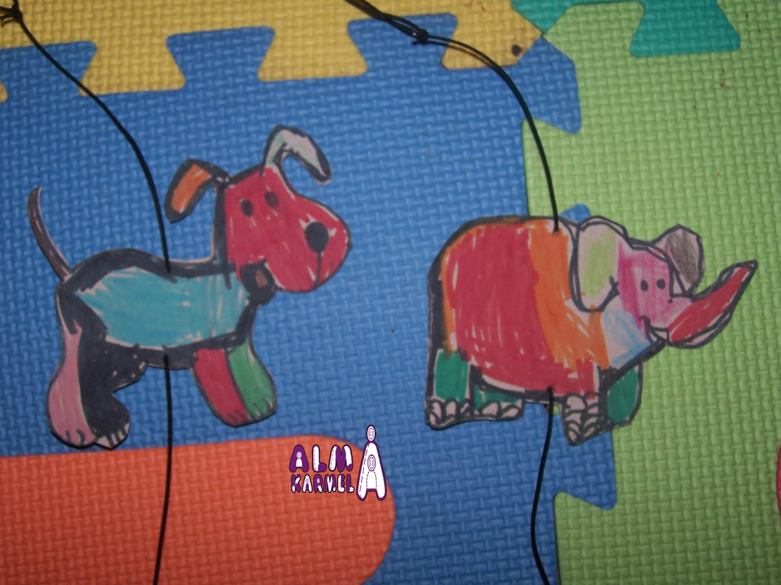 Una vez pintados, los recortamos. María tenía uno de esos días en los que le gusta pintar de muchos colores, jeje, de ahí lo artístico y colorido que le han quedado. Después le pregunté, qué quería hacer con ellos y me dijo que colgarlos en su habitación, y para ello sólo tuvimos que hacer un agujerito con un punzón en los animalitos para pasar un cordón y después colgarlos.