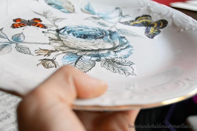 Para decorar con servilletas siempre tenemos que retirar las capas de papel que no tienen tinta. Normalmente vienen tres capas, quitamos dos, y nos quedamos con una.