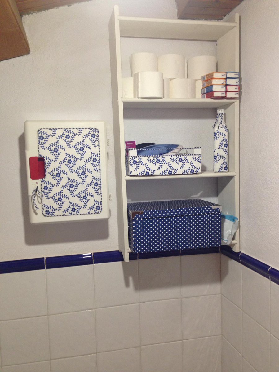 También elegí una botella de cristal que pintada en blanco y le hemos pegado la servilleta como a todo lo demás. Y aquí una foto del botiquín pintado de blanco pero aún sin tunear la tapa con la servilleta.