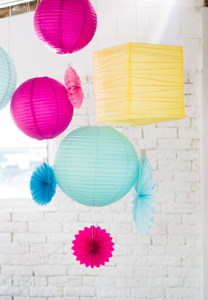 Para esta decoración, me decanté por colores fuertes, como azul, fucsía y amarillo. Con lámparas de papel de diferentes formas y tamaños.