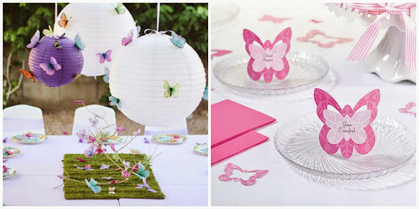 Si desean, hagan guirnaldas de mariposas que pueden ser colgadas al rededor la mesa, por arriba de un mantel blanco.