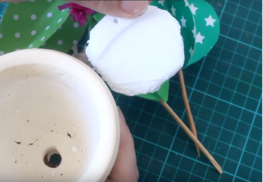 Para el armado, recortar un trozo de telgopor (en mi caso recorté un círculo de una tapa de envase de helados) y colocarlo en el fondo de la macetita..