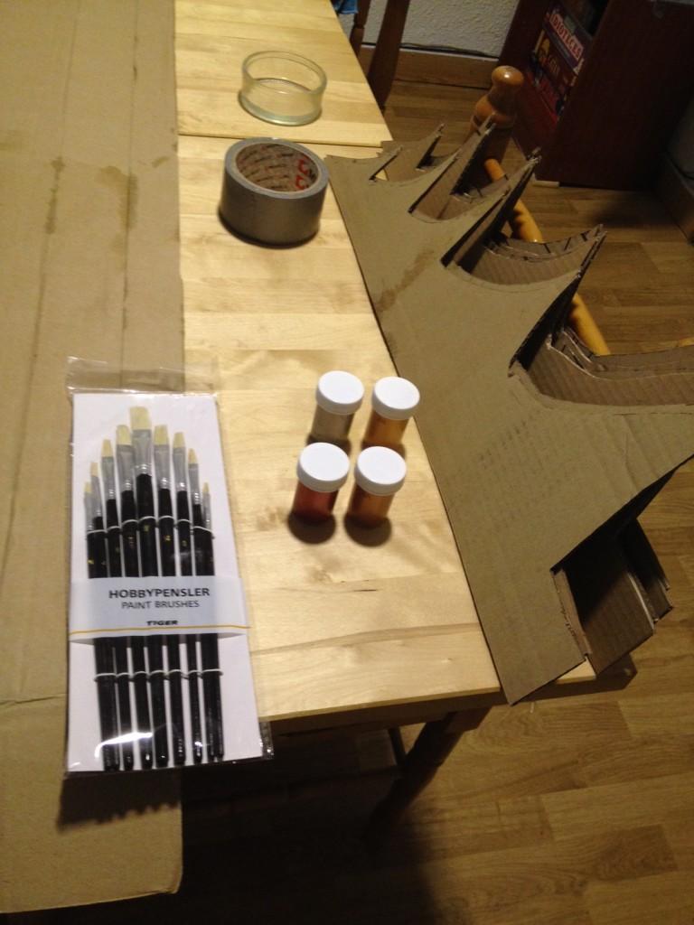 - Cinta de carrocero. No pega muy bien, pero como sólo hay que pegar cartón y después pintar encima, es la ideal.
