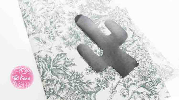 Lo primero que haremos será cortar en la tela la forma elegida para decorar el cesto. Nosotras hemos elegido un cactus bien bonito, así que con la ayuda de un lápiz dibujamos la silueta del cactus en la tela y recortamos dos cactus, para poner uno en cada lado del cesto.