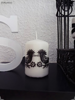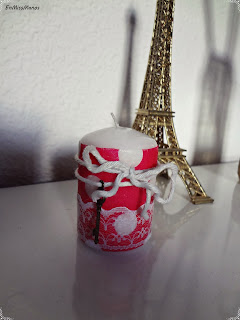 Esta otra vela la forré con decoupage, con unas servilletas que sólo había usado para hacer el maniquí vintage. A parte de esa vez, nunca más había probado a hacer decoupage y esta vela la hice con un gel de decoupage que compré hace poco. Luego le puse una puntilla blanca y una cuerda con el detallito de una llave, como podéis ver.