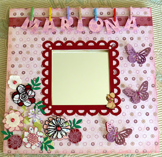 Un detalle que me parece puede dar mucho juego. Podemos colocar las letras de un nombre usando pequeñas pinzas de madera. Para las mariposas, las cortamos con un troquel y las pegamos sólo en la parte central, así podemos levantar las alas y dejar que salgan del espejo como si volaran.