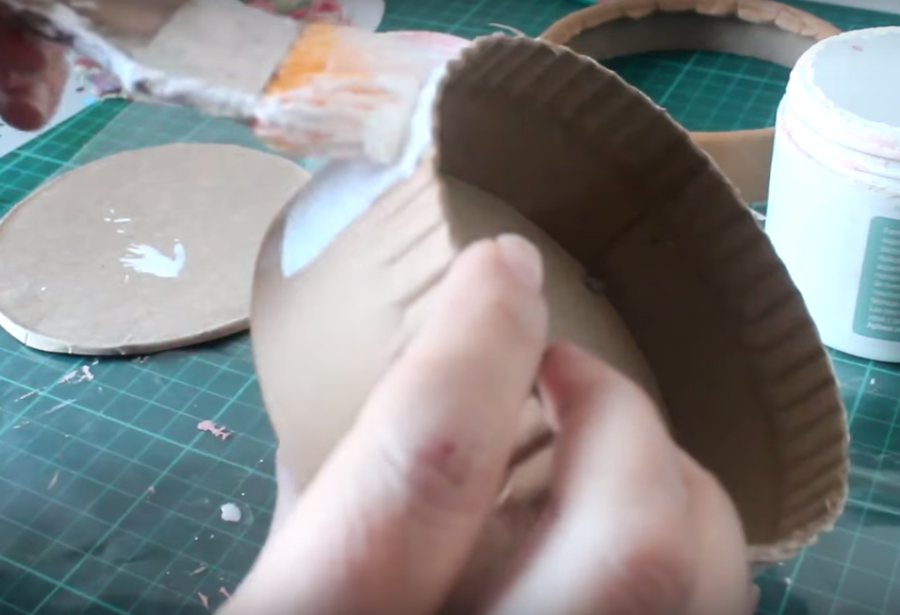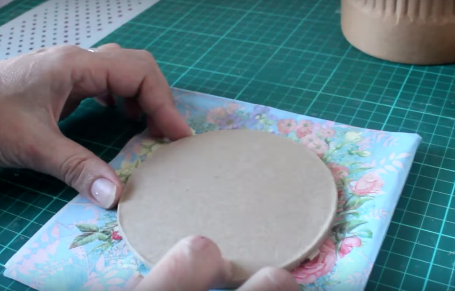 Para el decoupage vamos a utilizar una servilleta decorada, para eso vamos a tomar la medida utilizando el círculo de cartón de la tapa.