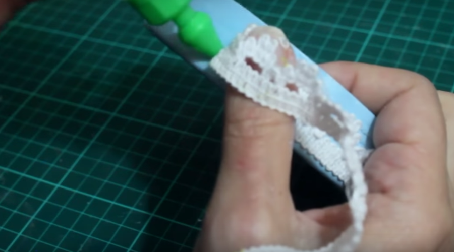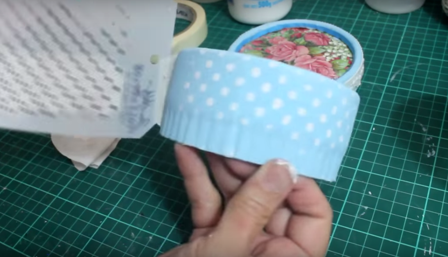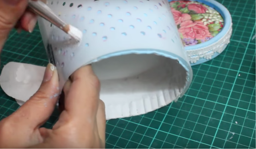 Para decorar la tapa colocamos silicona fría y pegamos una puntilla...