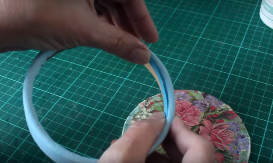 Con pegamento blanco pegamos al aro el círculo que tiene hecho el decoupage.