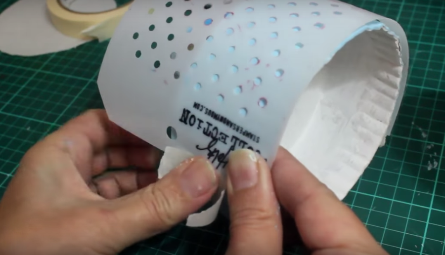 y para decorar la parte inferior de la caja, fijamos un stencil de lunares o topitos con un poco de cinta de papel o de carrocero...(es conveniente pegar y despegar varias veces sobre la mesa el trozo de cinta que vamos a utilizar para restarle adherencia y así evitar que saque la pintura que hemos colocado)