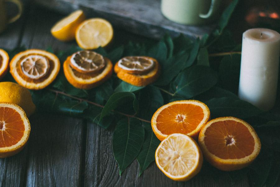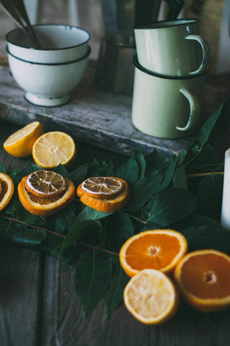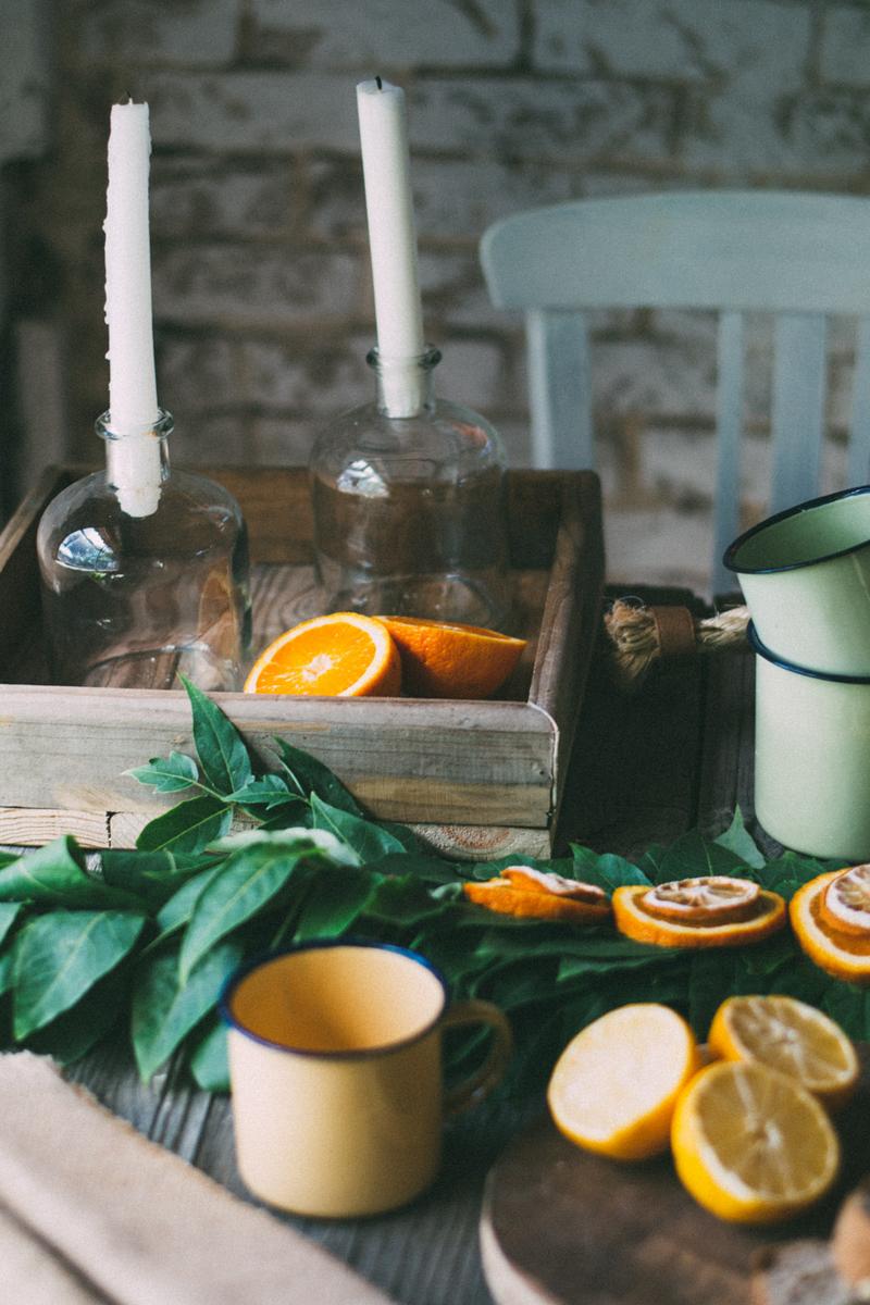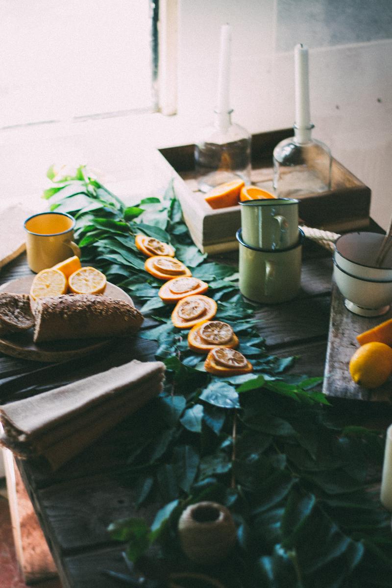 Una guirnalda en la mesa diy, hecha con alambre, hojas y ramas y naranjas cortadas en láminas para darle un toque de color.