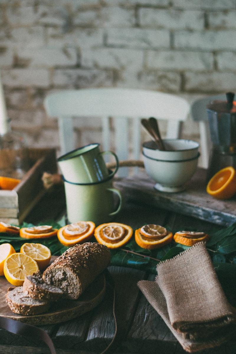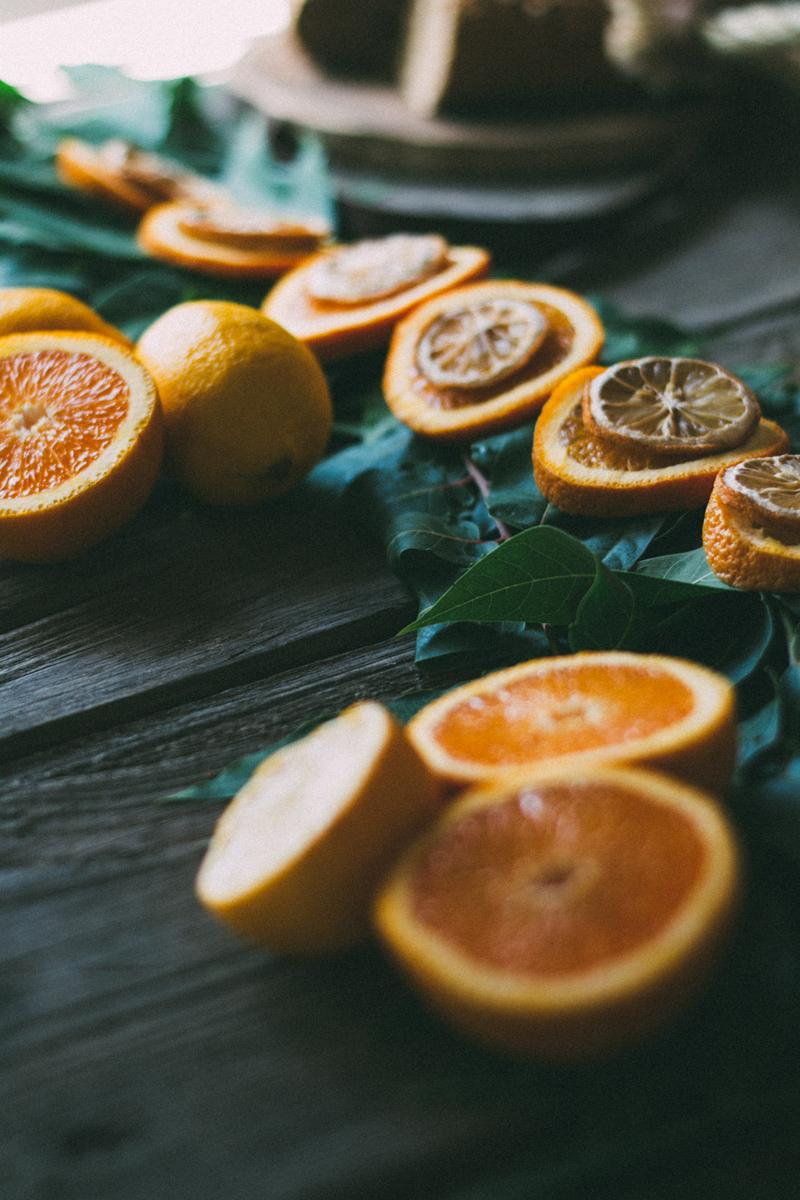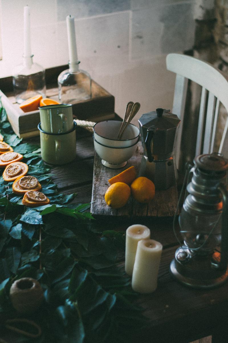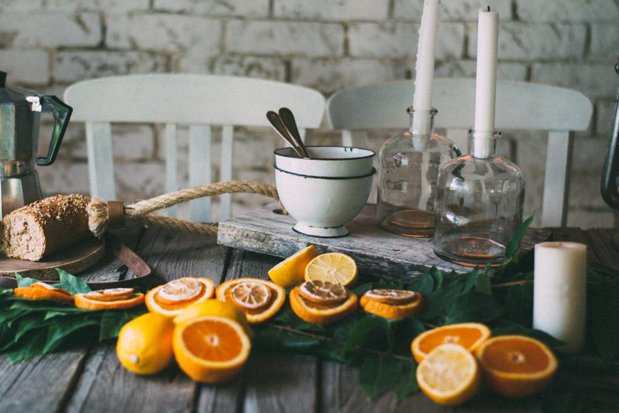 Una guirnalda en la mesa diy, hecha con alambre, hojas y ramas y naranjas cortadas en láminas para darle un toque de color.