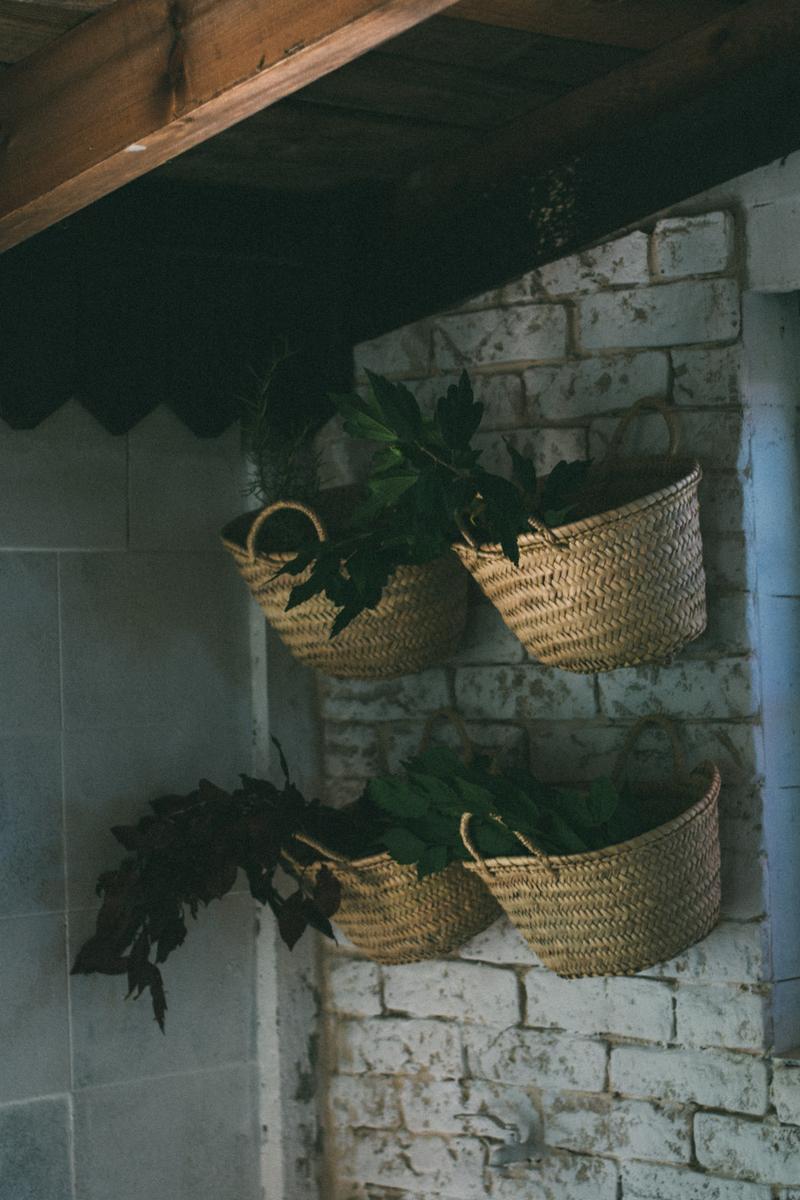 Unos cestos llenos de diferentes ramas y hojas del campo o jardín para decorar el espacio y la mesa.