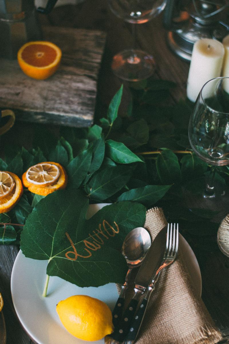 Como servilletas, podemos usar trozos de arpillera. Para indicar los sitios, podemos utilizar hojas del jardín escritas con un rotulador dorado o plateado.
