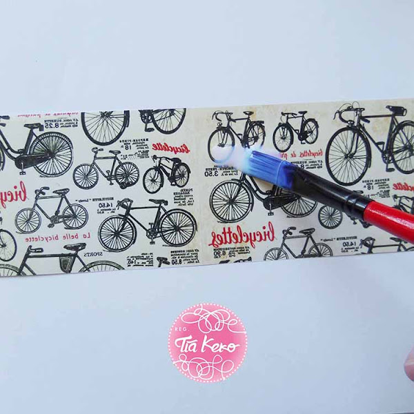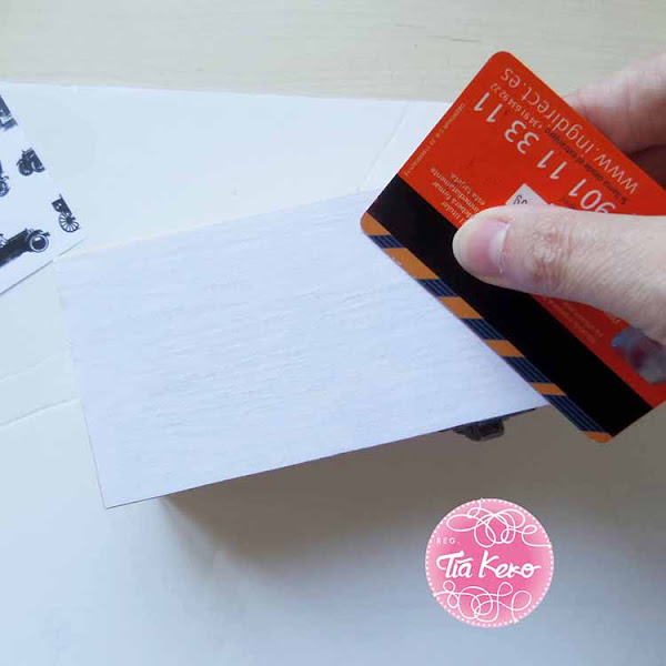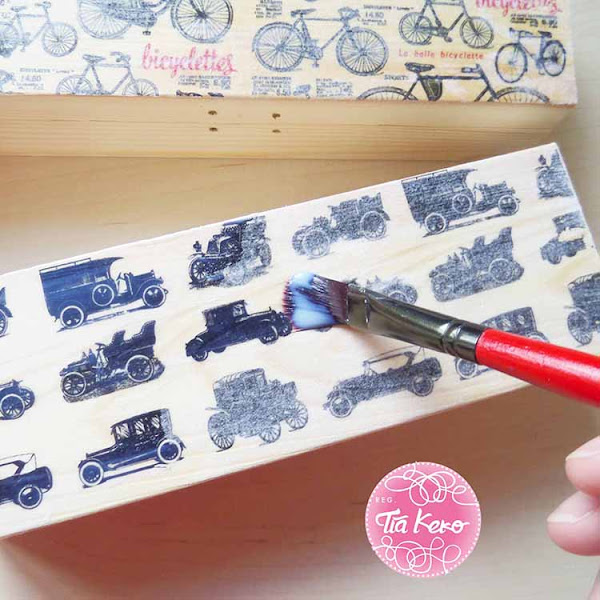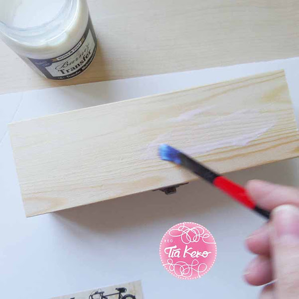 Para transferir la imagen debemos dar una capa de barniz especial para transfer a la caja de madera, luego damos otra capa de barniz a la imagen a transferir y por último pegamos esa imagen en la madera y le damos con una tarjeta de crédito o similar por toda la superficie para que se pegue muy bien y para sacar el exceso de barniz que pueda haber, lo haremos igual que en las imágenes posteriores,