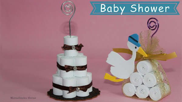 Hoy os enseño como hacer éstos dos detalles para regalar en un bautizo o Baby Shower. Unos bonitos y originales portarrecados de cigüeña de pañales y una tarta. Descubre como hacerlos.