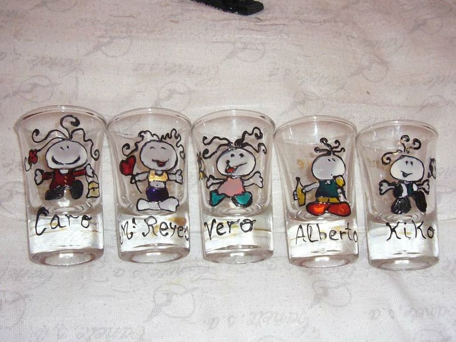 Huhugirl se decidió por una idea muy original: vasos de chupitos personalizados para los invitados. Cada vasito llevaba una graciosa caricatura con pintura de vidrio, y nuestra lectora tuvo la aplicada constancia necesaria para realizar… ¡casi doscientos ejemplares!