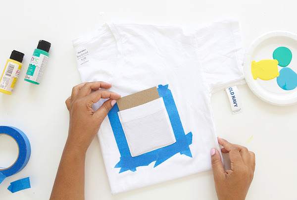 1. Empezamos protegiendo el bolsillo de la camiseta con cinta de carrocero, y con un cartón por dentro del bolsillo, para que al pintar no manche la tela de abajo.