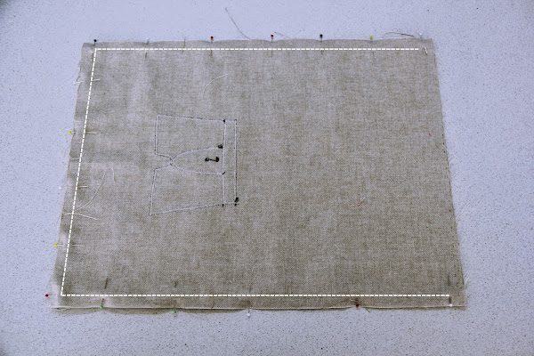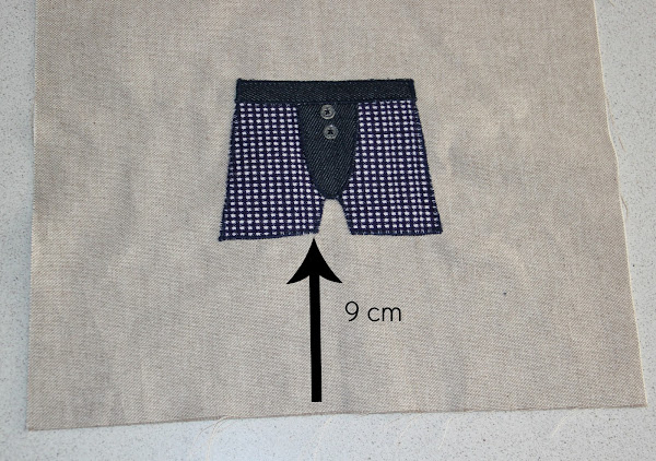 1 - Aplicamos el dibujo (podeis descargarlo aquí) a una de las telas exteriores, a 9 cm de la parte inferior. Si no sabéis hacer aplicaciones, hay multitud de tutoriales por la red. Yo os dejo aquí unos cuantos enlaces que os podrán ser de gran utilidad: