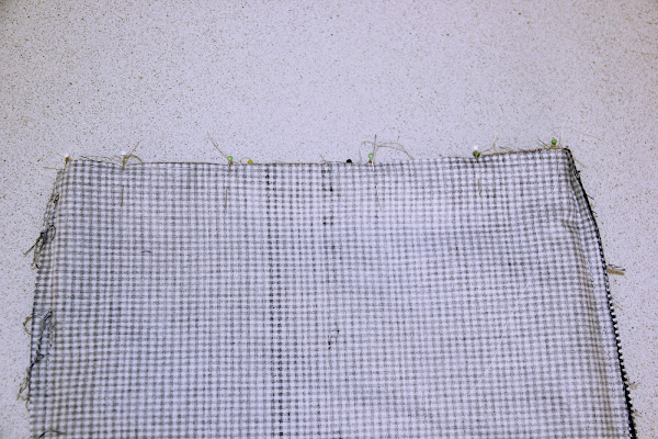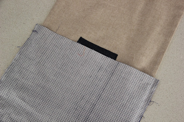 5 - Doblar la goma y colocarla entre el forro y la tela exterior trasera. Tenemos que tener cuidado con que quede bien centrada.