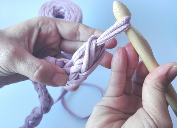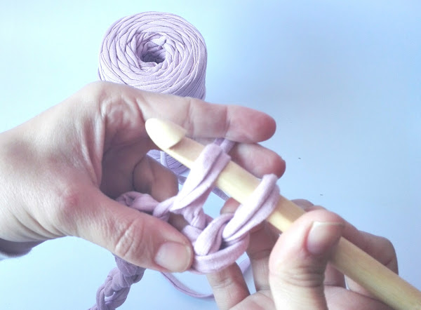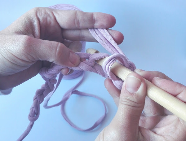 Después empezamos a tejer, haciendo CADENETA, harás tantos puntos como quieras que sea de ancho tu bolso, mi tamaño son unas 16 - 18 puntos. Simplemente cojes el "hilo" de trapillo y lo sacas por dentro del punto.