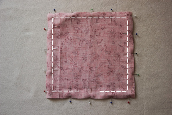 Planchamos y doblamos las cuatro esquinas a 6 cm del borde, como vemos en la imagen. Fijarlas con alfileres.