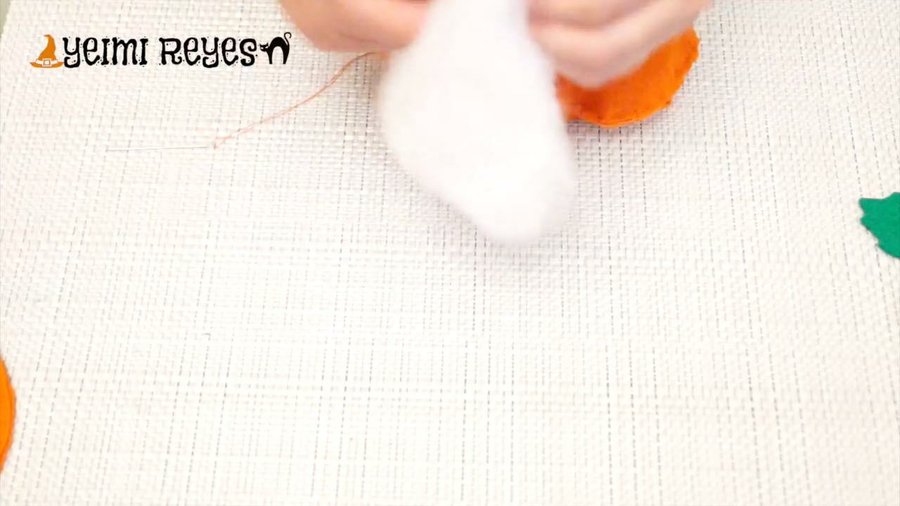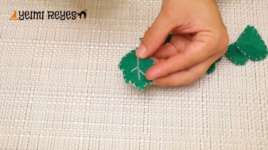 Toda calabaza tiene sus hojas así que a estas le daremos un toque lindo pasando una costura en todo los bordes y en el centro simulando las ventas de la hoja, esto también lo puedes hacer con pintura acrílica color oro