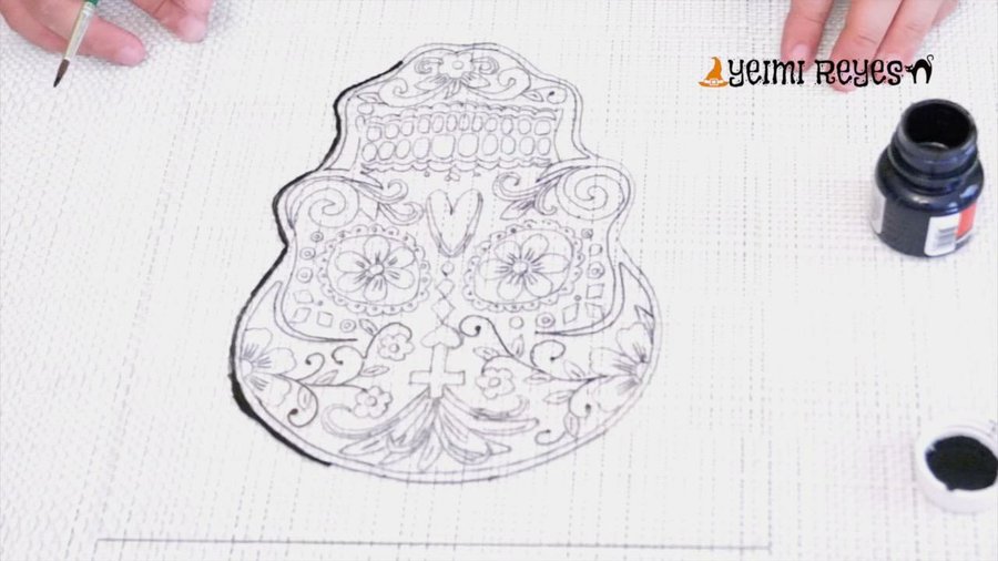 Ya que tenemos el dibujo en el vidrio remarcamos cada borde y detalle con pintura acrílica negra con un pincel delgado si no lo tienes puedes utilizar un pasador, horquilla como te muestro en la imagen.