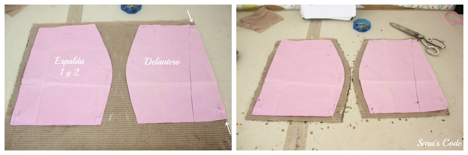 ♥ Colocamos los patrones encima de la tela doblada y los sujetamos con alfileres.