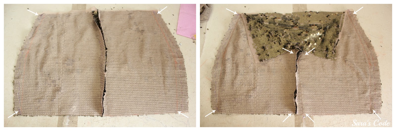 Normalmente antes de coser sobre una tela de lentejuelas, habría que quitar cada una de las lentejuelas que cubren desde la parte de la tela por donde vamos a coser hasta el borde exterior. Pero cuando quise hacer esta falda no disponía de mucho tiempo así que tuve que saltarme este paso.