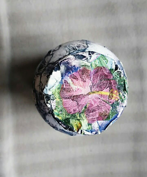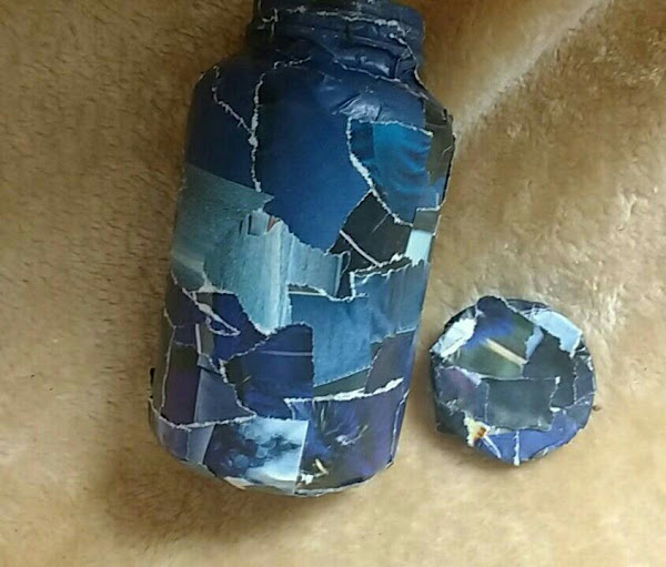 El tarro de vitaminas lo cubrí con trozos en azul, y el resultado fue chulísimo. Es un bote que uso para meter monedas de 10 y 20 céntimos, porque a veces las necesitamos para el secador de la piscina, para la ORA...y yo siempre tiendo a deshacerme de lo suelto, así que las guardo ahí. Puse unas flores en tonos morados y me gusta mucho el resultado. En la tapa también puse una flor.