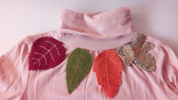 - Elige el diseño y disposición que tendrán las hojas. Yo las puse alrededor del cuello como si fuese un collar y coloqué debajo otras más pequeñas como si se cayesen de un árbol. Puede coserlas o pegarlas con pegamento textil.