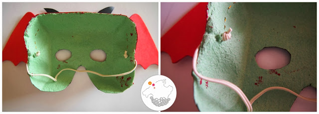 Por la parte trasera, hacemos dos agujeritos para pasar una goma o cordón para sujetar la máscara por detrás de la cabeza.