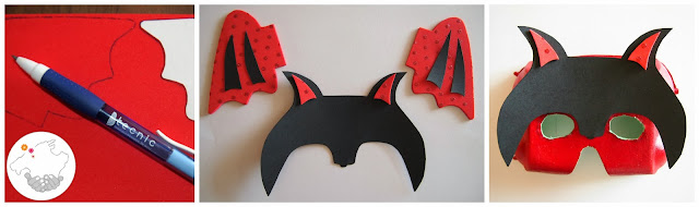 Lo que tenéis que hacer es marcar con un rotulador, lápiz o boli la silueta de cara y los triángulos de las alas en la cartulina negra, y las alas y los triángulos de las orejas en la goma eva del otro color.