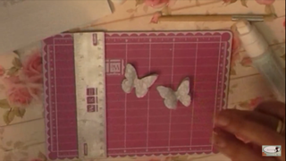 Luego con n troquel de mariposas, sacamos cuatro, pegamos una encima de modo que nos queden dos mariposas dobles, le colocamos en el medio 2 media perlita, las pegamos sobre la cinta y listo.