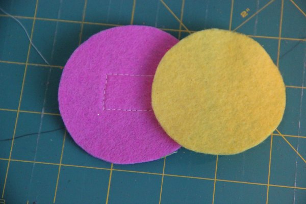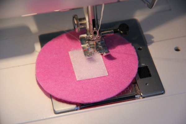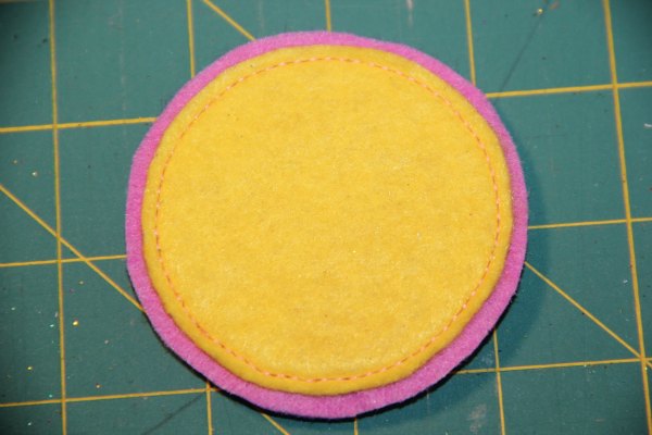 Después haremos un pespunte, a máquina, alrededor del círculo pequeño. Yo normalmente utilizo el color del círculo grande para el hilo del pespunte.