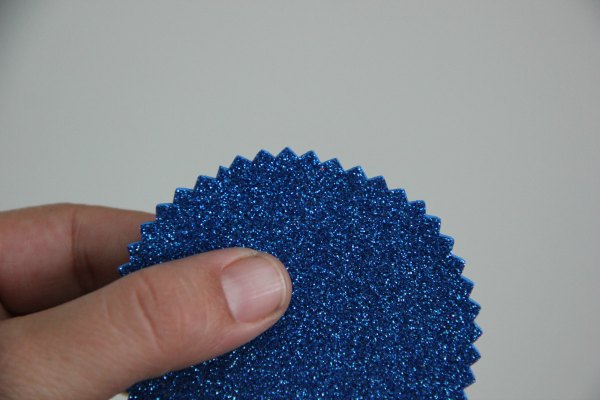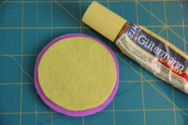 Y pegamos por el otro lado el círculo más pequeño. Yo utilizo pegamento textil.