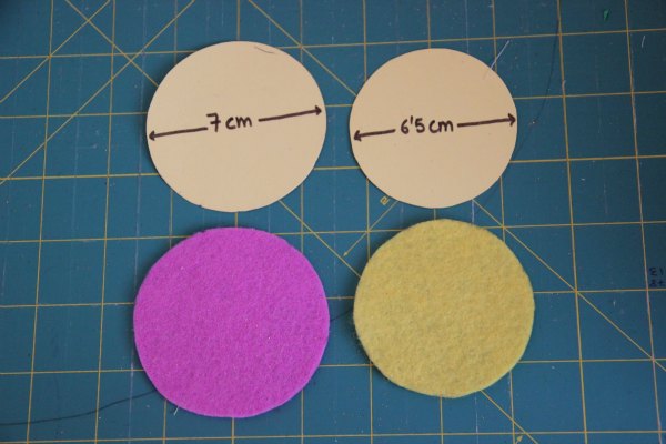 Al igual que en el caso anterior lo primero que debemos hacer es sacar los moldes. Esta vez son dos, uno de 7 cm y el otro de 65 cm. El siguiente paso será sacar un círculo de cada tamaño en fieltro de diferentes colores.