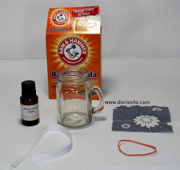 Los materiales que vas a necesitar son: Baking Soda, aceite esencial de menta o el de preferencia, frasco, pedazo de tela y cinta.