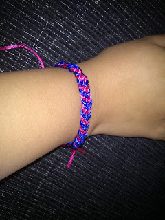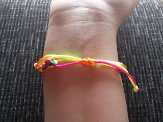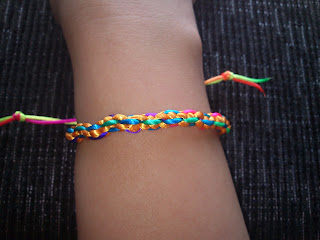 Como podéis observar es uno de los muchos ejemplos de colocación de los hilos, el hilo utilizado es el conocido como Cola de Ratón. En las siguientes imágenes tenéis el resultado de la pulsera y al final realicé un nudo corredizo para que se me adapte mejor la pulsera.
