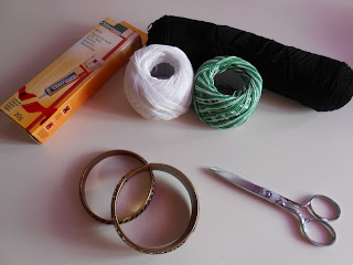 A continuación tenéis los materiales que necesitamos: - pulseras viejas o que ya no nos gusten- hilo de crochet de los colores que más nos gusten- tijeras- pegamento (en mi caso utilicé pegamento textil pero si no tenéis no pasa nada, con una gotita de cualquier pegamento funciona)