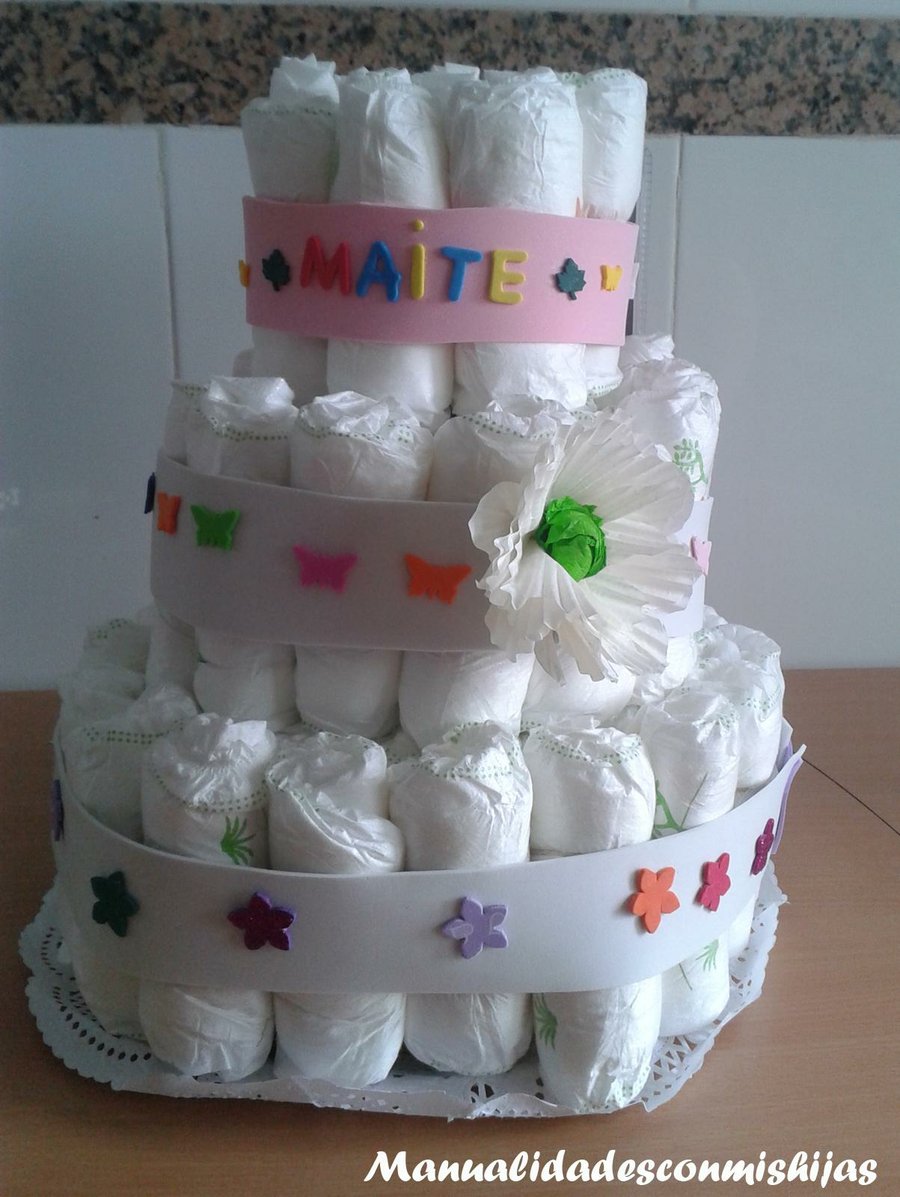 La siguiente propuesta de tarta de pañales nos la trae Manualidades con mis hijas una idea de regalo un poco más asequible y no por ello menos práctica.