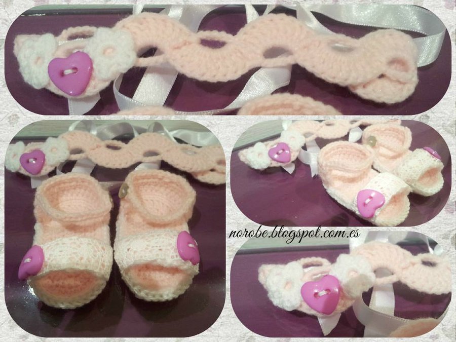 La siguiente idea va dirigida a los amantes del crochet, como yo, y sólo vale si el recién nacido es niña. La propuesta viene del blog de Norobe en el cual nos da las pautas a seguir para realizar este precioso conjunto de diadema y zapatitos a partir de un poco de lana de bebé en colores blanco y rosa, botones decorativos con forma de corazón, un trozo de cinta de encaje para adornar los zapatitos, lazo blanco para atar la diadema y un par de botones pequeños para cerrar las sandalias.