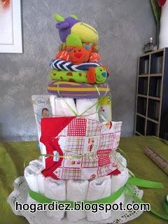 La tercera propuesta nos llega de la mano del blog Hogardiez que foto a foto nos muestra cómo montar la estructura de pañales de una forma diferente y cómo ir colocando los regalitos además de darnos una idea de cómo envolver de una forma atractiva el regalo. Los materiales que necesitamos son prácticamente los mismos que los de las propuestas anteriores añadiendo algún que otro juguetito.